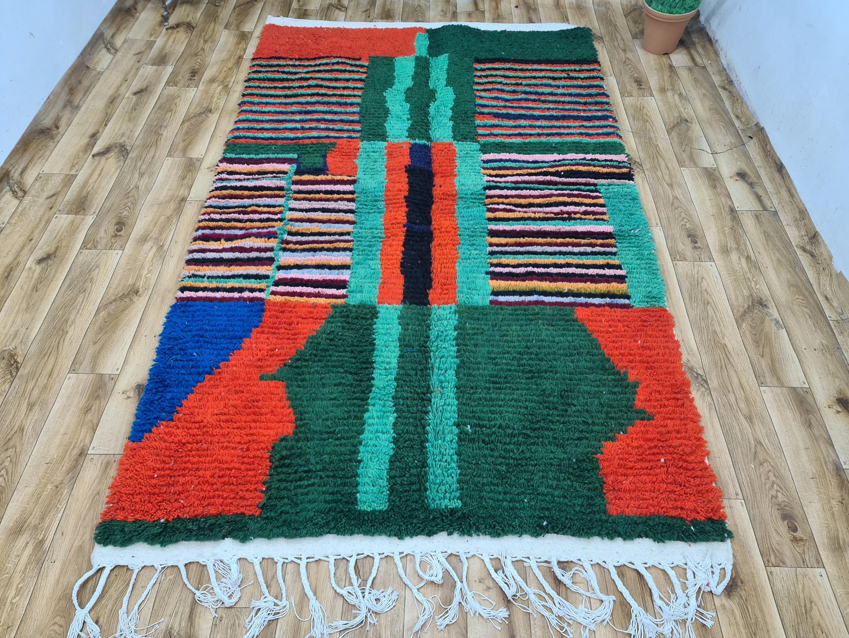 This multicolored abstract rug features a striking mix of emerald green, royal blue, red, and orange, creating a stunning visual harmony between Moroccan tradition and modern design.