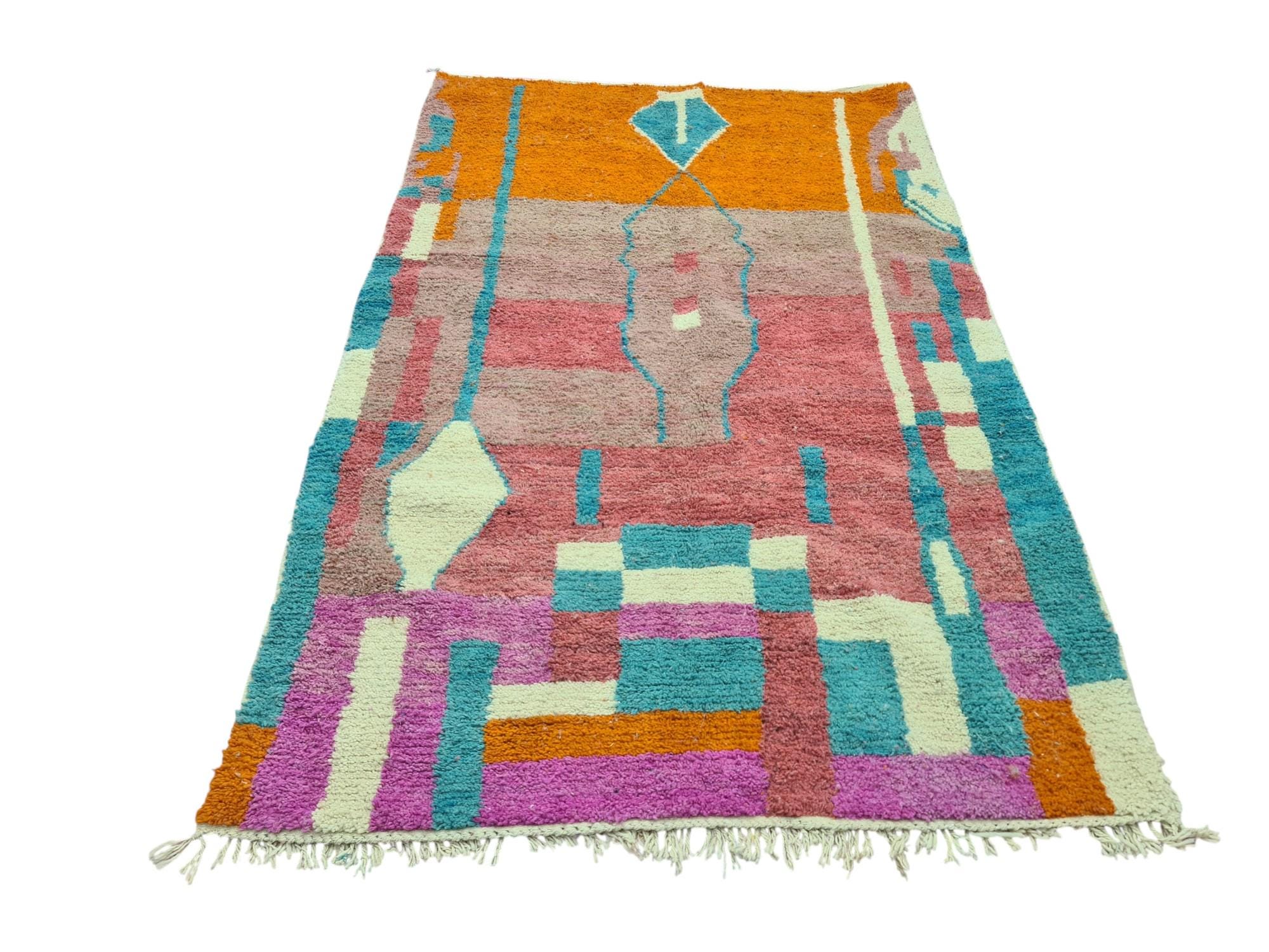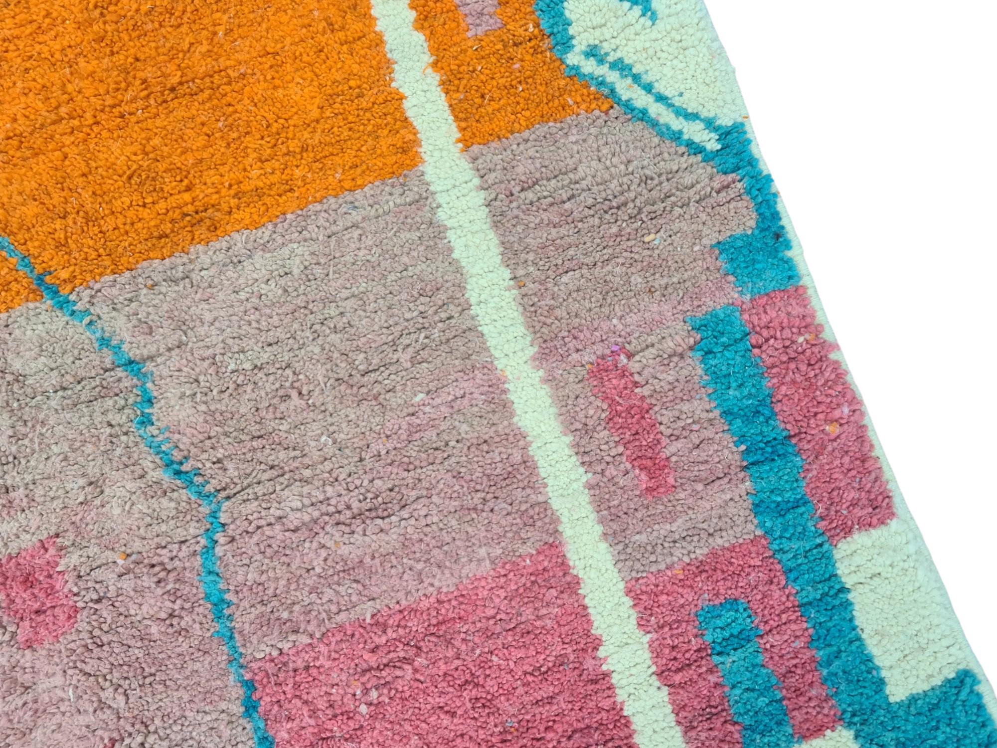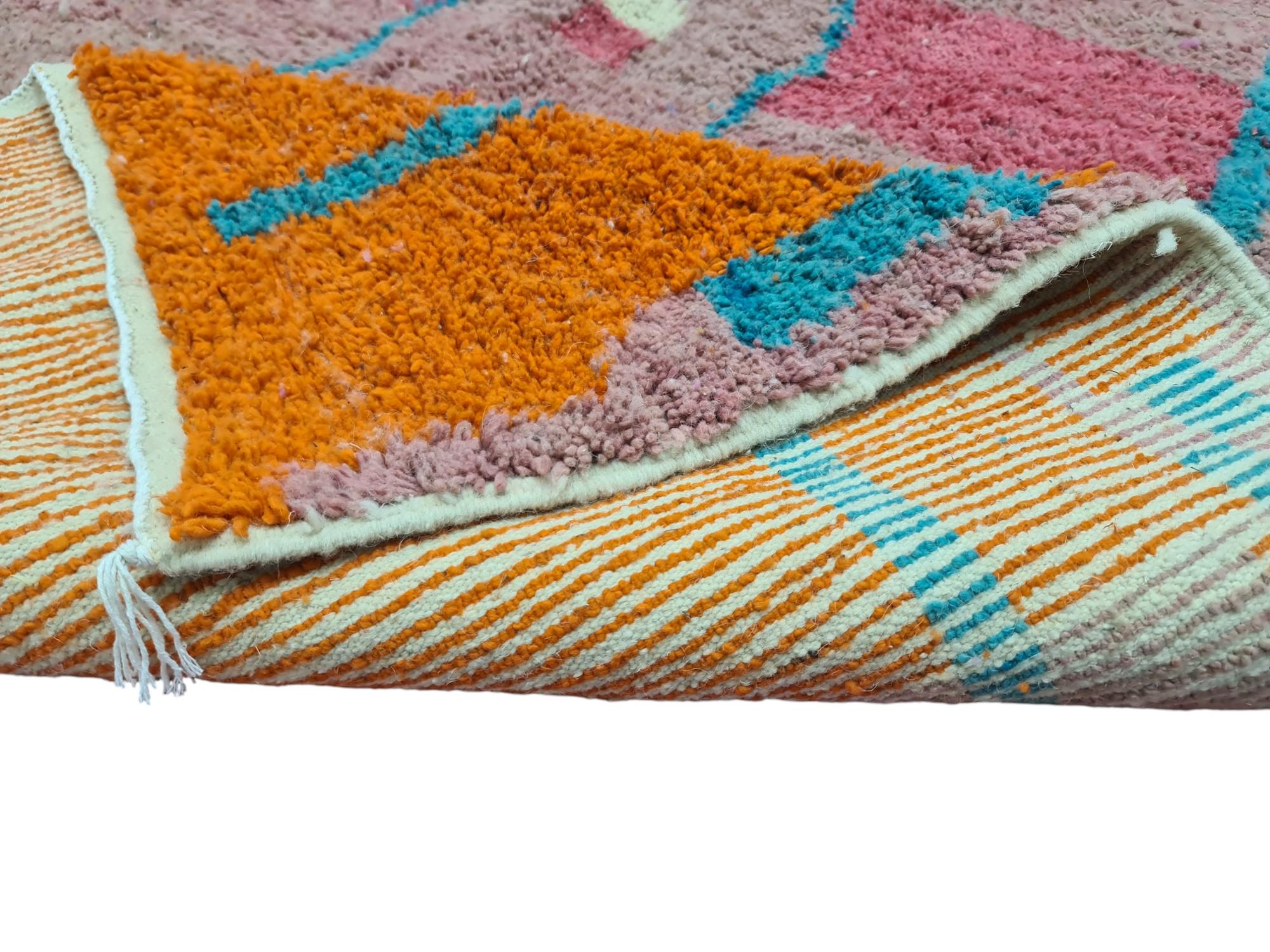 Transform your living space with our stunning Beni Ourain rug, a true embodiment of authentic Moroccan artistry. This handmade rug showcases a vibrant geometric design in hues of orange, pink, blue, and white, making it a captivating centerpiece for any room.