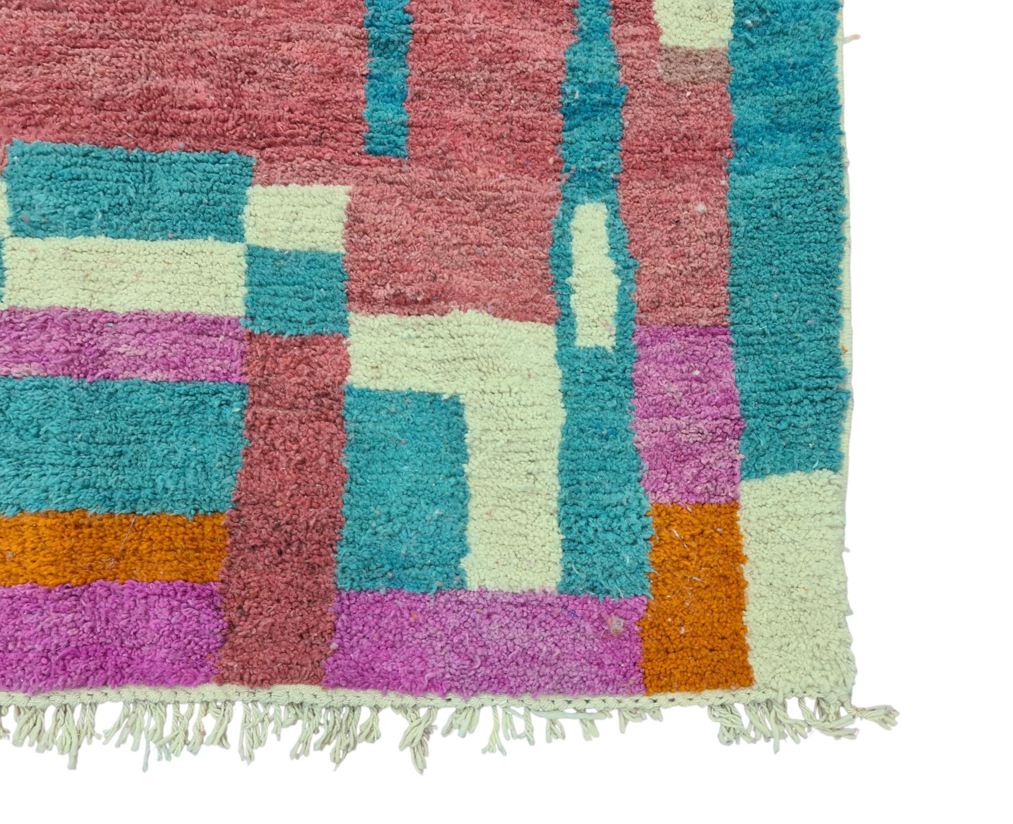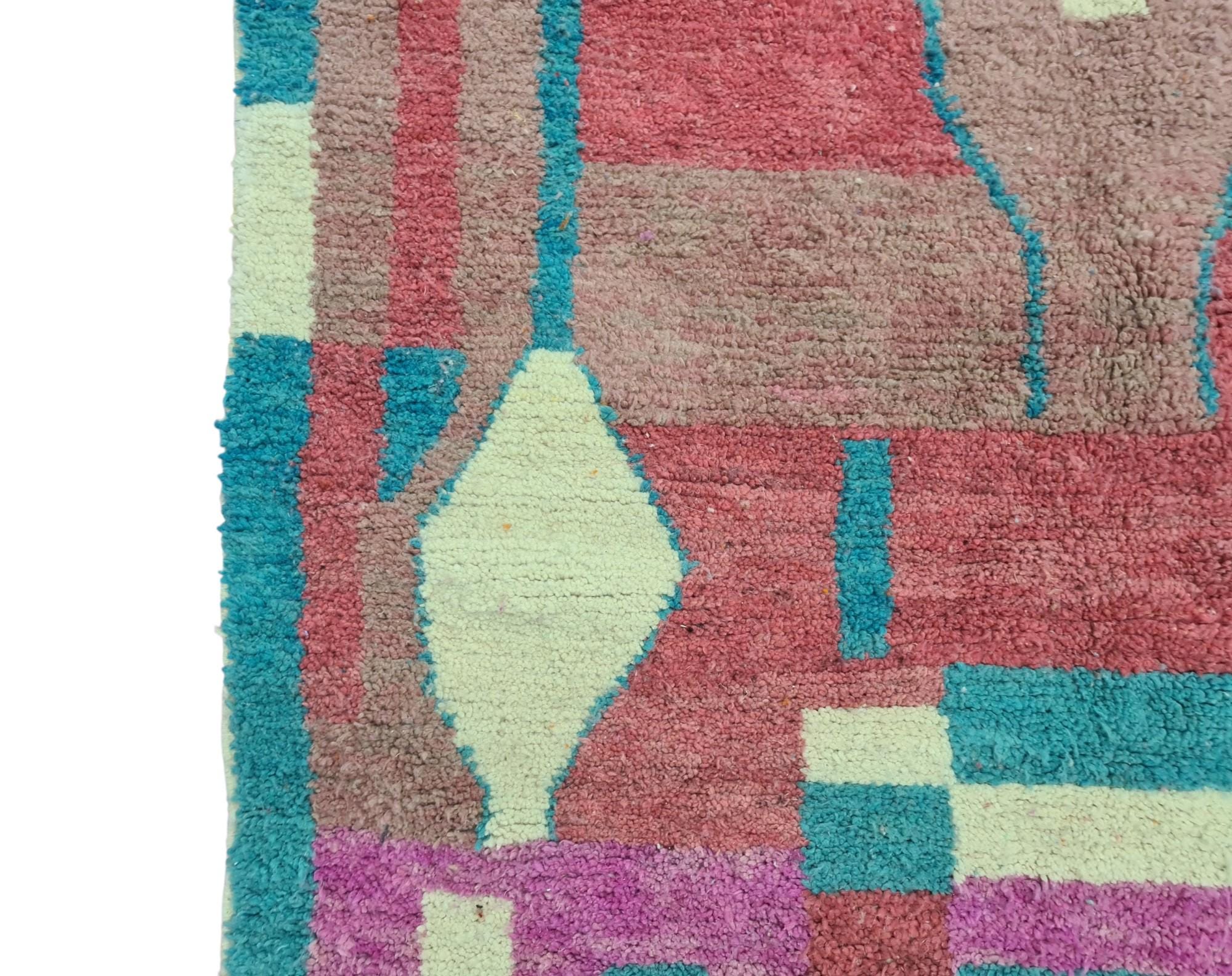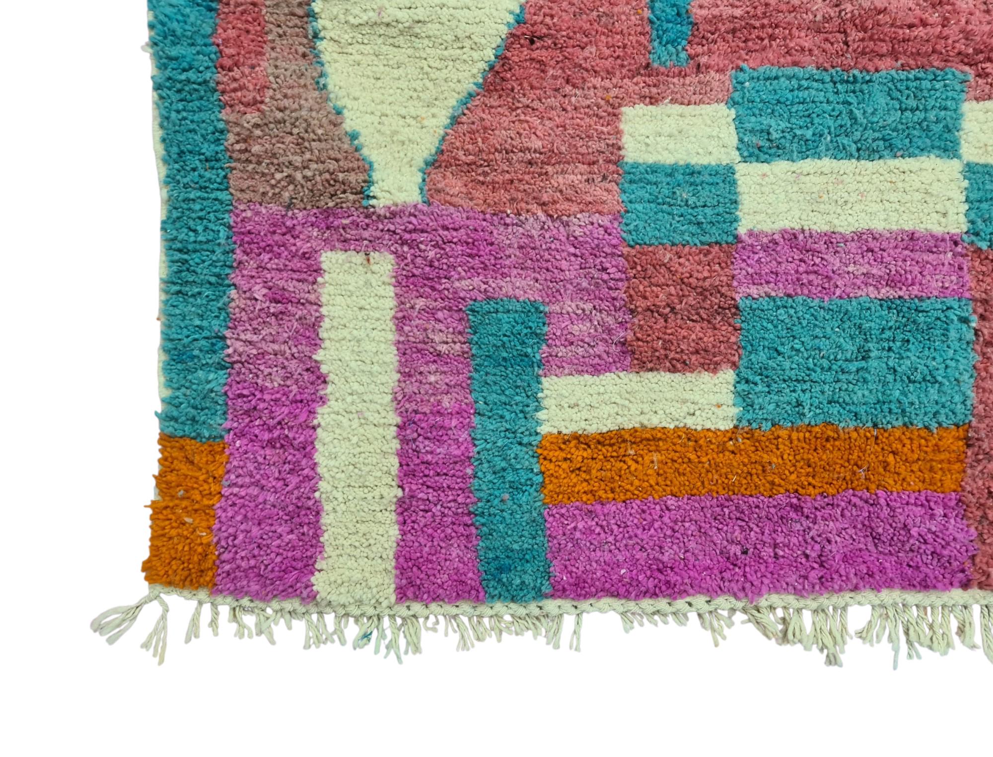 Transform your living space with our stunning Beni Ourain rug, a true embodiment of authentic Moroccan artistry. This handmade rug showcases a vibrant geometric design in hues of orange, pink, blue, and white, making it a captivating centerpiece for any room.