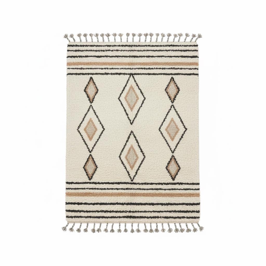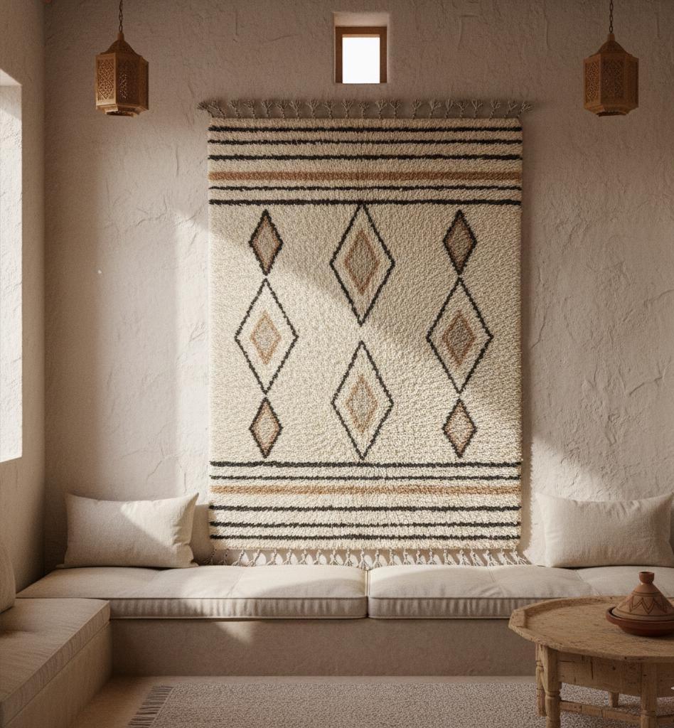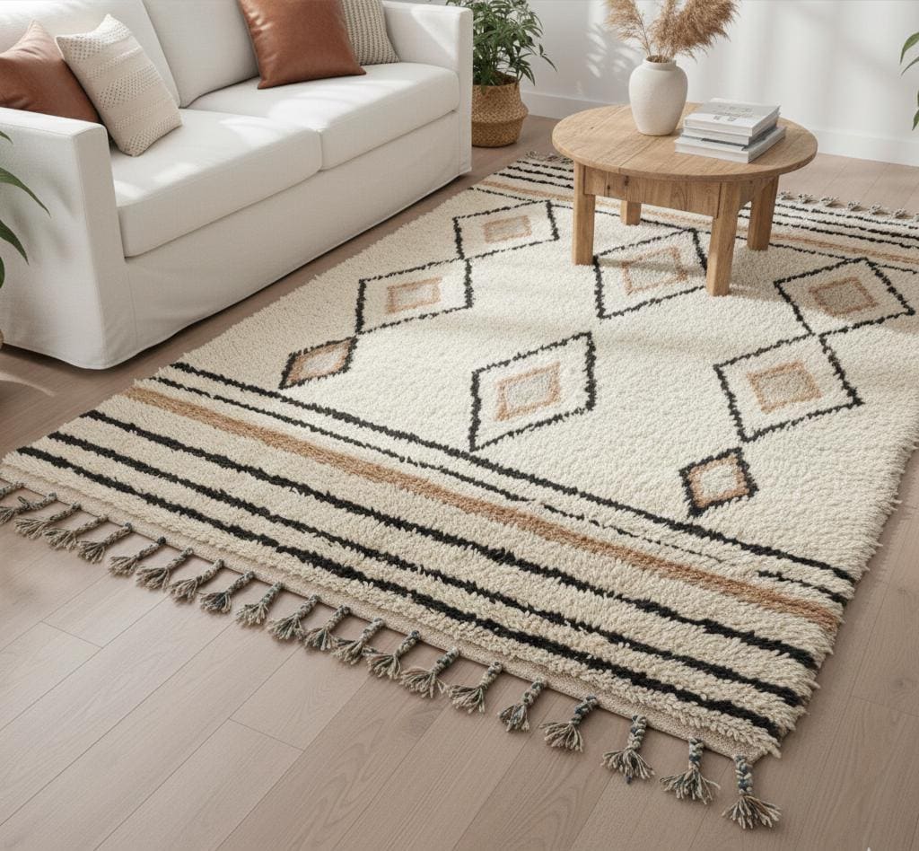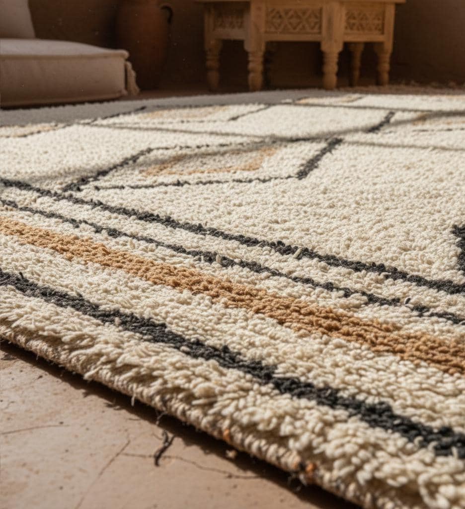 We use only high-quality, 100% natural Moroccan wool. The design is a timeless Beni Ourain pattern—a creamy ivory base with those essential black and warm beige geometric accents. It has a comfortable medium pile, making it wonderfully soft for a bedroom carpet, yet practical enough for a busy living room.