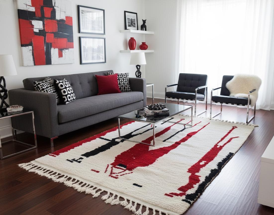 Off-white rug with a geometric design in red and black. The rug has a thick, textured pile and a fringe along the bottom edge. The design features abstract shapes and lines.