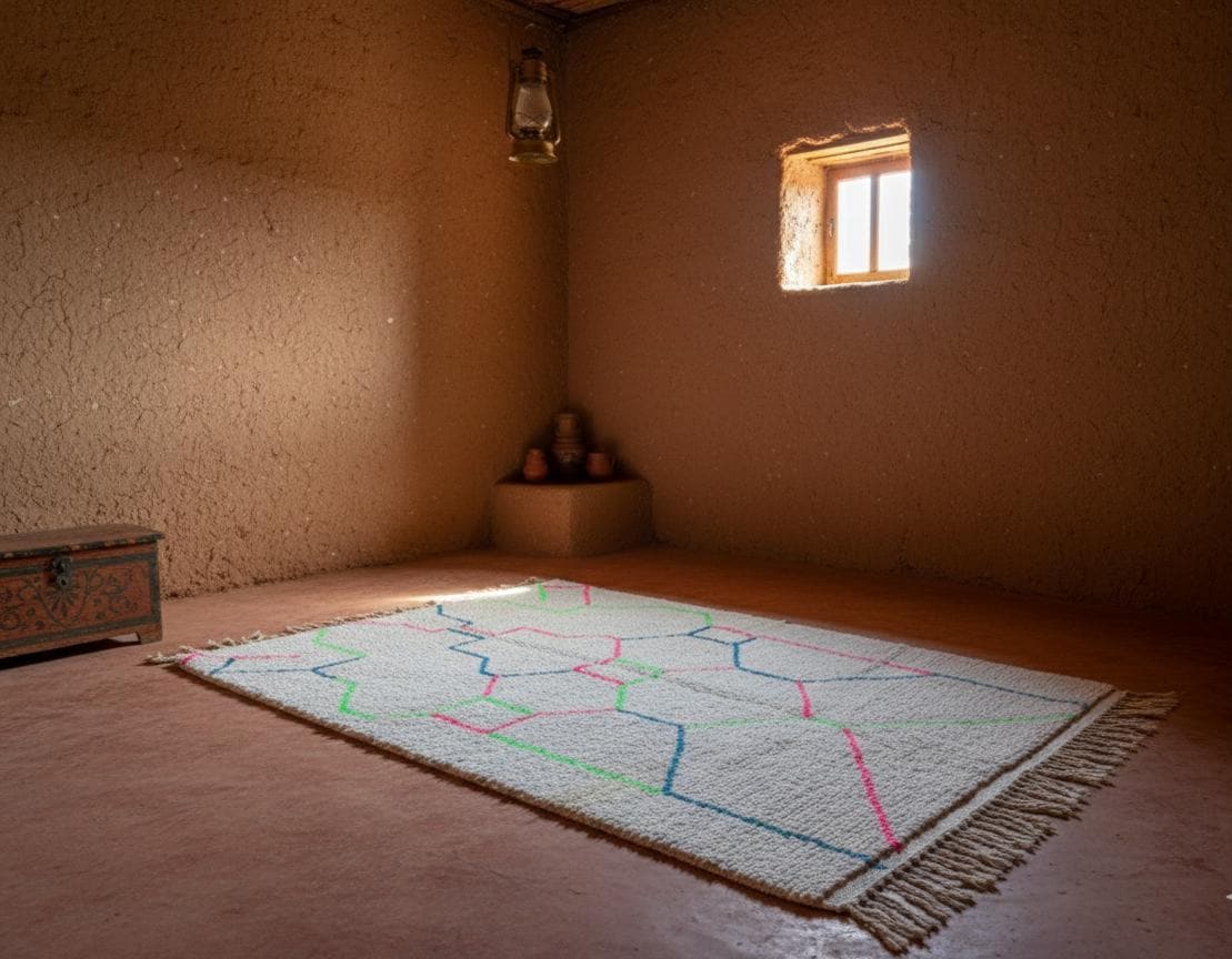 Neon Geometric Rug with Fringe | Off-White Abstract Area Rug | Custom Pink Green Blue Lines