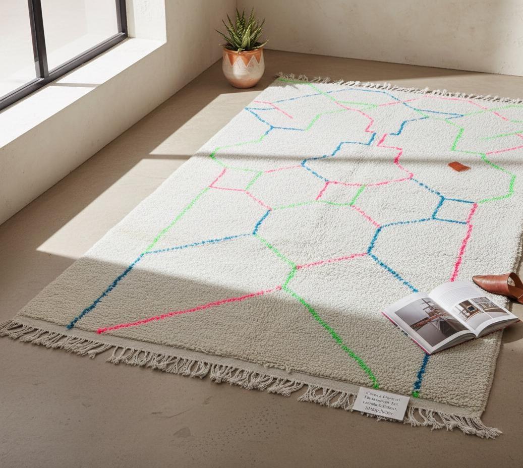 Vibrant Geometric Area Rug | Fringe Detail | Off-White Base with Neon Pink, Blue, Green